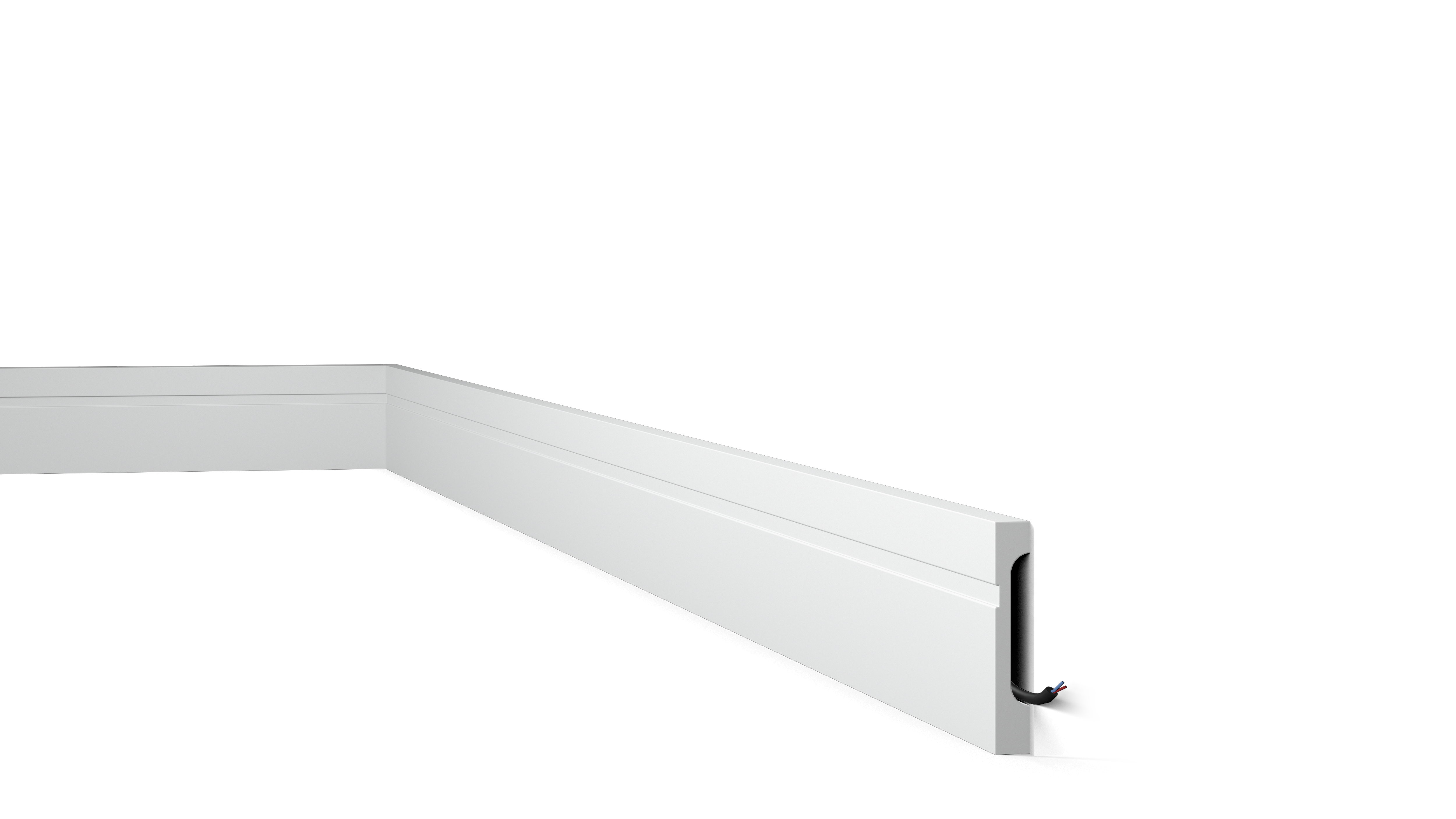 The FD11 is moisture-resistant and ideal for humid bathrooms and kitchens. The FD11 arrives primed and ready for painting in the final colour. Behind the skirting is a narrow gap for concealing small wiring or imperfect transitions.
